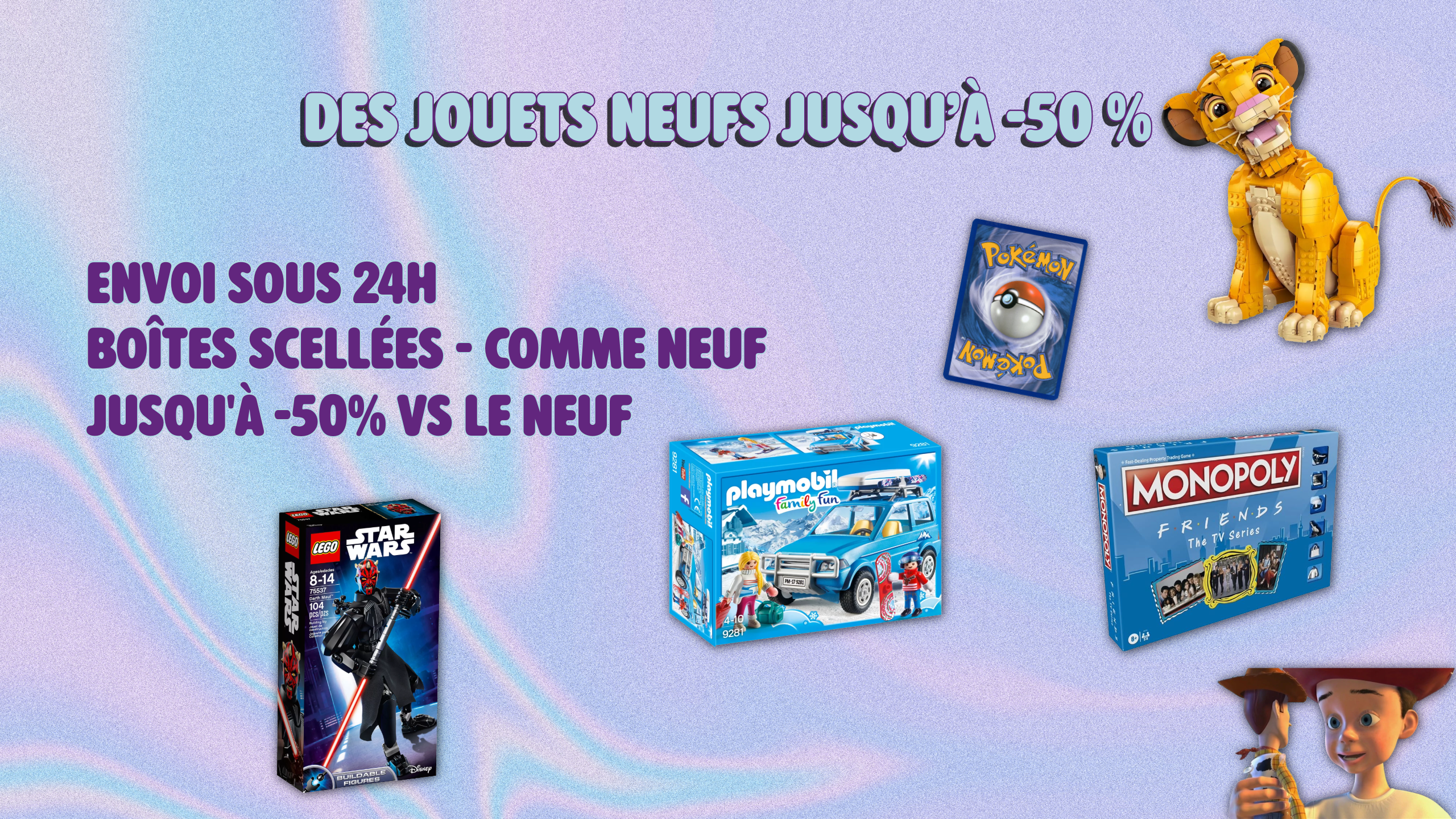 Des jouets d'occasion en super état — souvent neufs — pour offrir une nouvelle vie à des trésors oubliés (LEGO, Playmobil & cie).